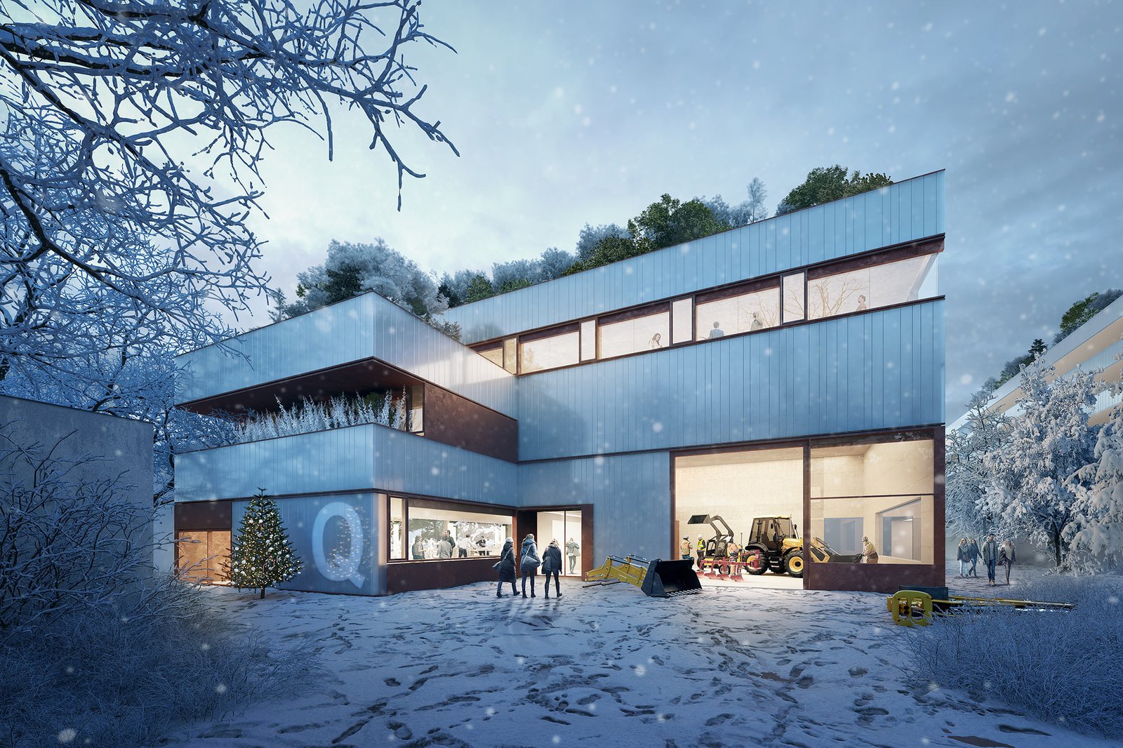 Existing design features of the existing neighboring buildings, e.g. the covered passageways, will be continued.The result is an overall picture of the campus site, with an interplay of old and new.The three selective new buildings play with their direct and partly older neighbors through their smooth and very technical façades.The result is three dynamic building types that convey the range and diversity of research at the site both during the day and at night. The roof areas, like the inner courtyards, can be incorporated into the institutional work as green roof terraces by staggering the building levels. The outdoor area is designed to be correspondingly open and lively with generous areas for functional access and recreational areas.