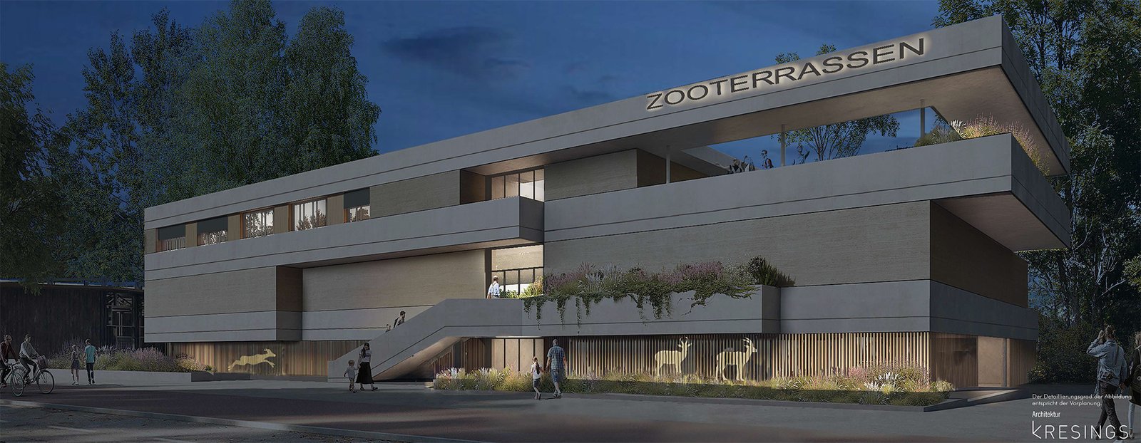 A modern multifunctional building with restaurants, event rooms and offices for the zoo administration as well as a parking level will be created.