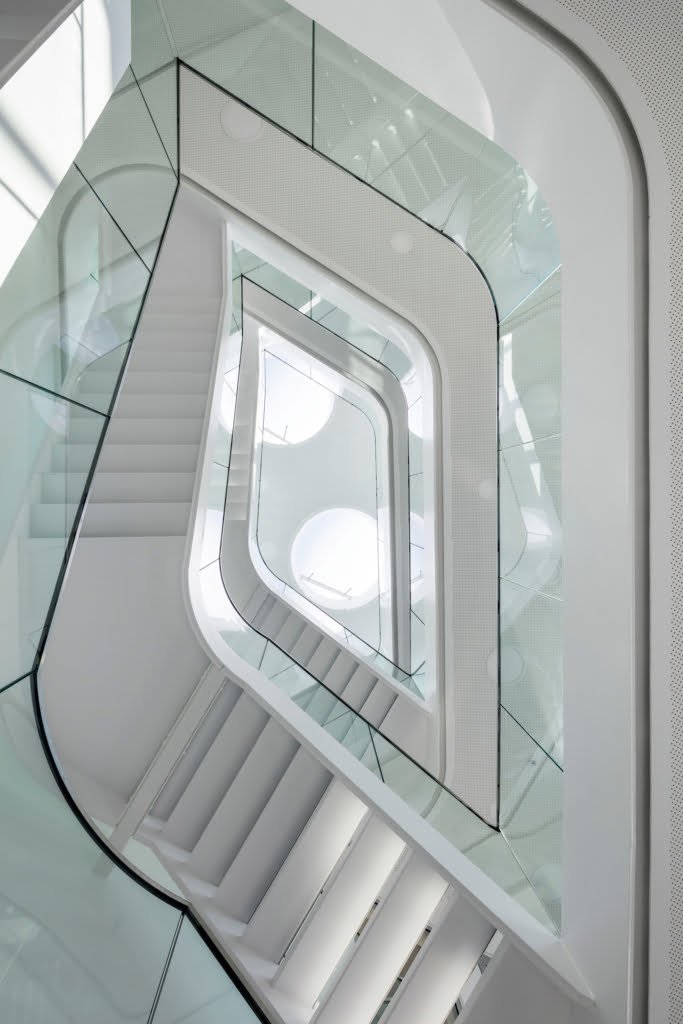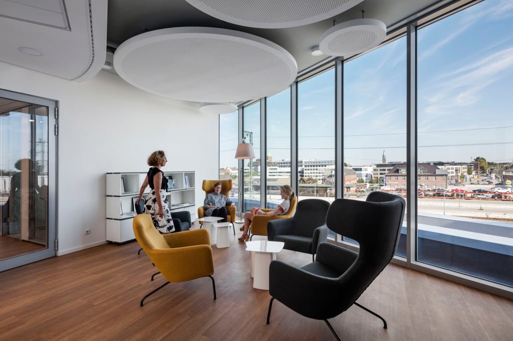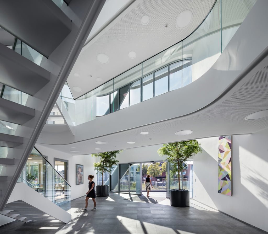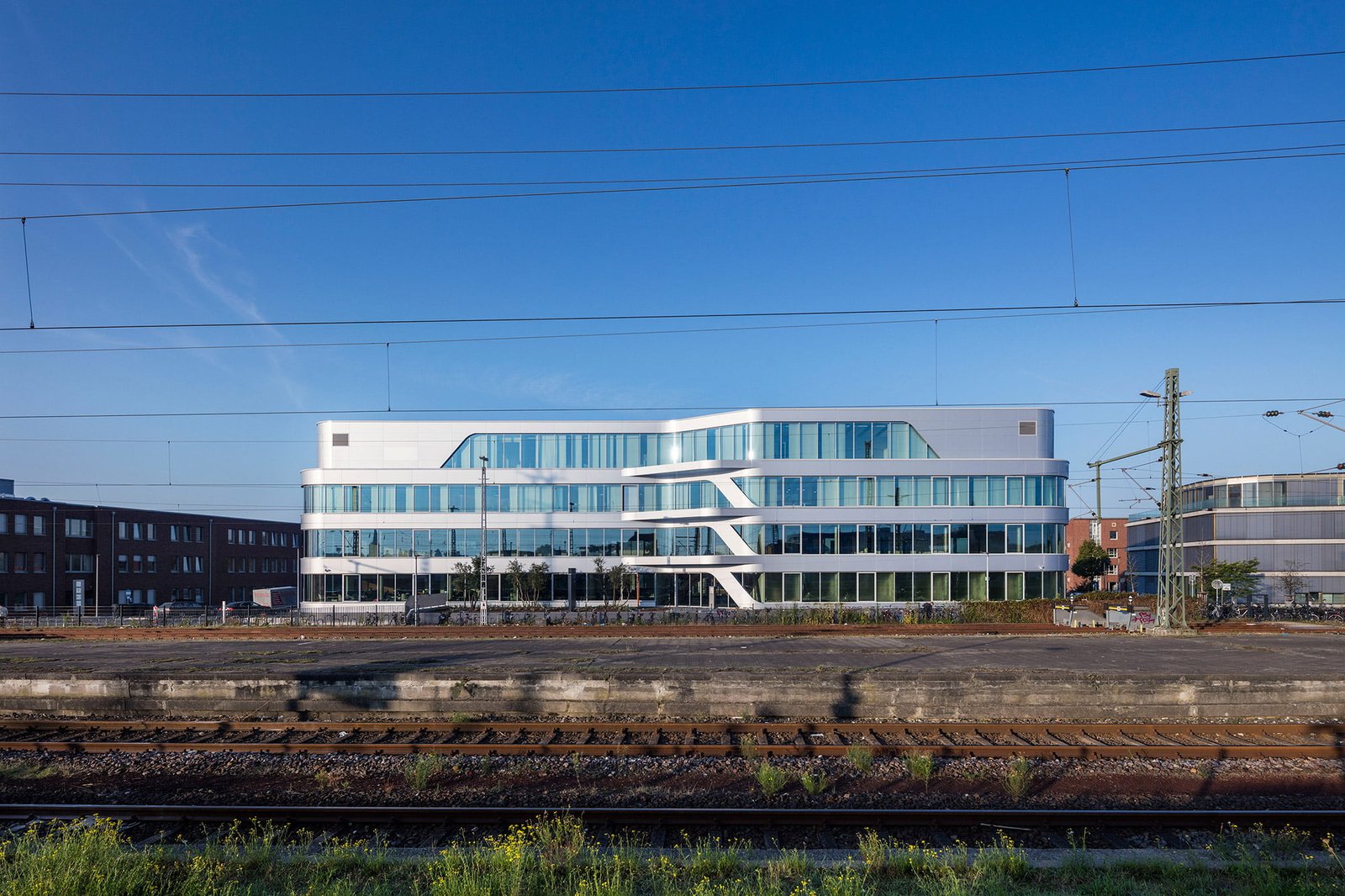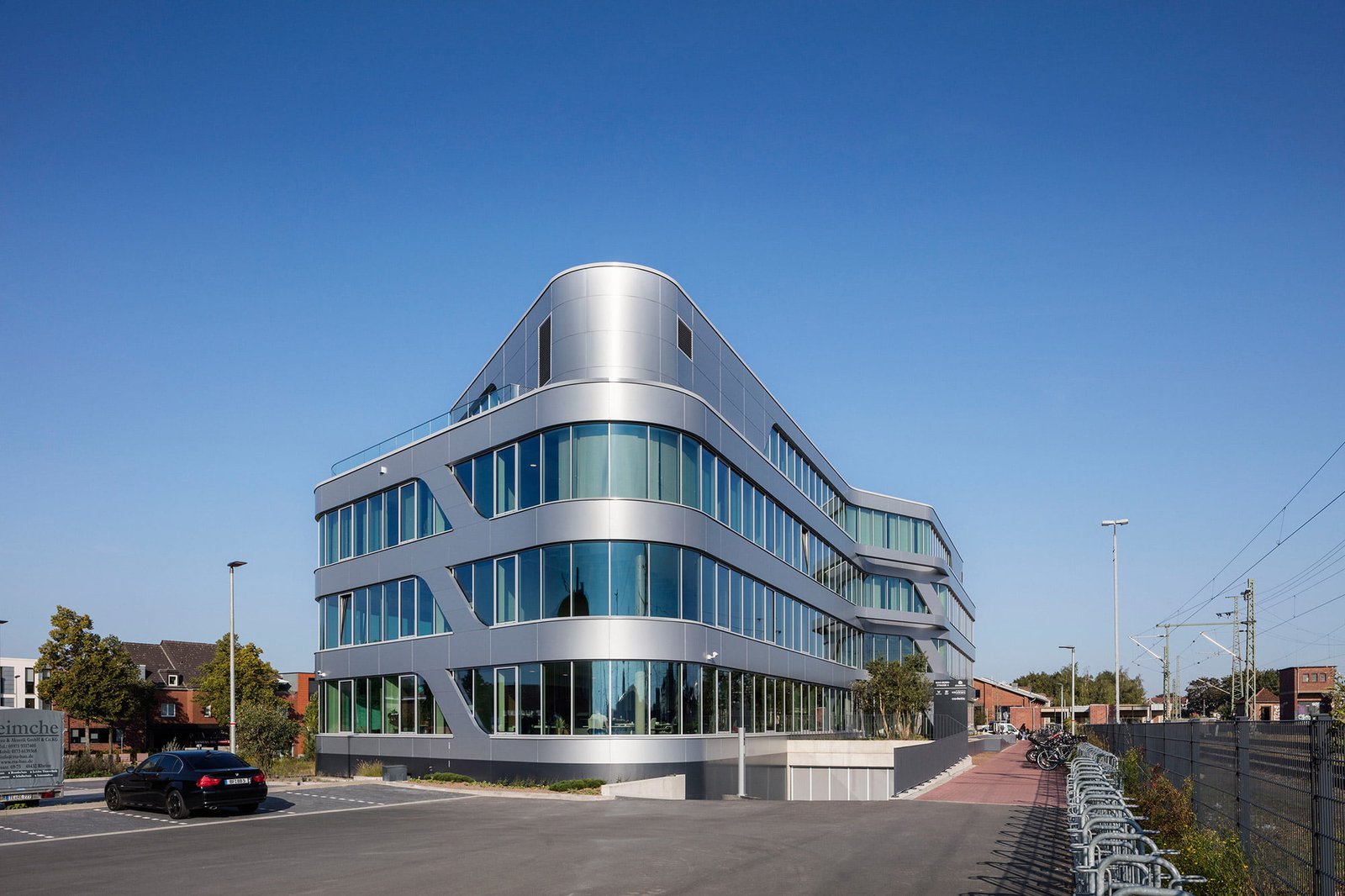 Der Umriss des environ im Innovationsquartier direkt am Bahnhof Rheine weist keine rechten Winkel auf, nur runde Ecken. Die hinterlüftete Leichtmetallfassade mit Dreifachverglasung ist zunächst durch eine Bänderung horizontal gegliedert. Die strenge Horizontale wird aber durch schräg verlaufende Fassadenbänder und auskragende Fassadenelemente aufgebrochen. Durch die Metallstruktur gemeinsam mit den vielen Glasflächen erscheint das Gebäude sehr grafisch. Neben einem Softwareentwickler gibt es hier vor allem Co Working Spaces, die man temporär anmieten kann.