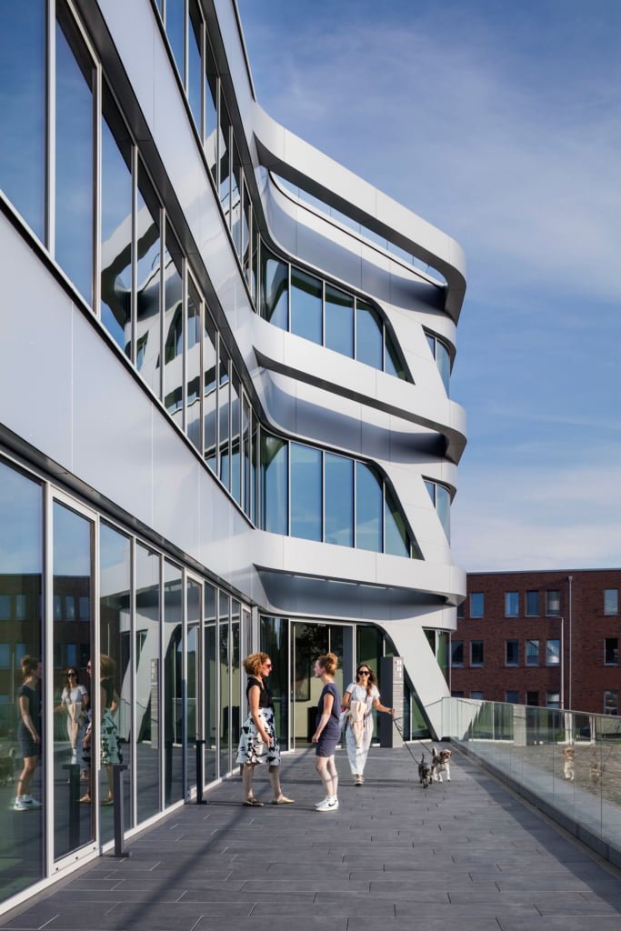 Die grafische Metallfassade prägt das Bürogebäude im Innovationsquartier von Rheine.