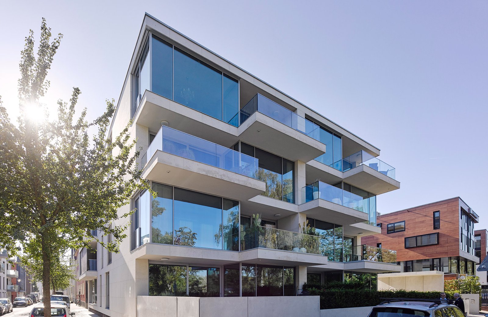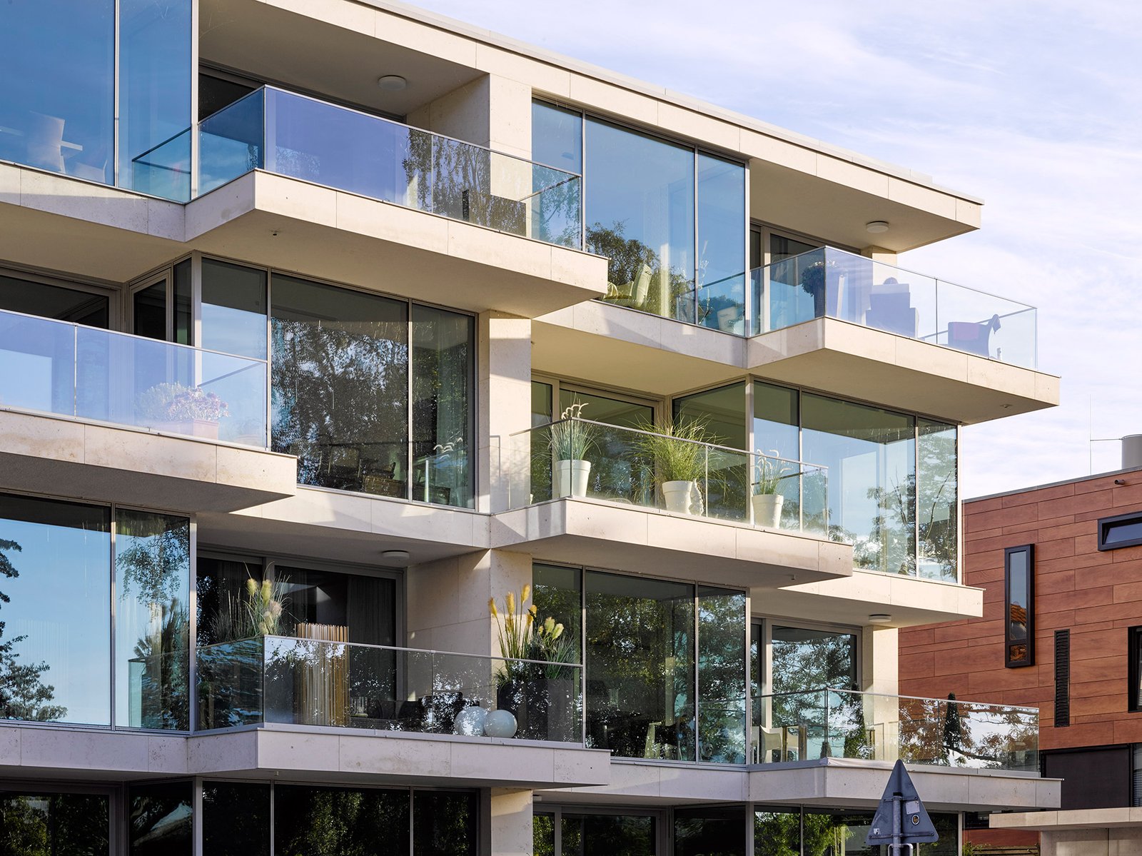 Lage und Gestaltung der Häuser entsprechen dem Wunsch nach besonderer Privatheit inmitten von Stadtkontext und Freizeitsituation. Der Entwurf sieht in den gestapelten Geschossen mit durchgezogenen Decken Wohnungen mit großzügigen puristischen Grundrissen vor. Alle Einheiten verfügen über einen Blick zum Wasser. Die obere Studio-Etage öffnet sich über die Dachgärten zur Weite des Sees.