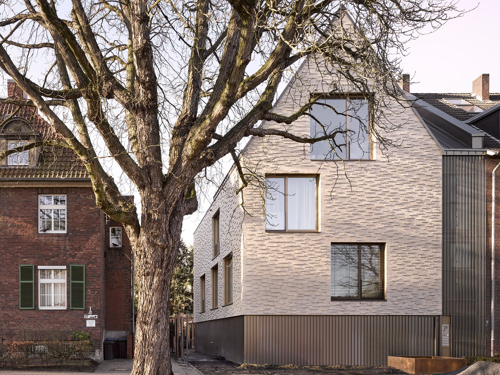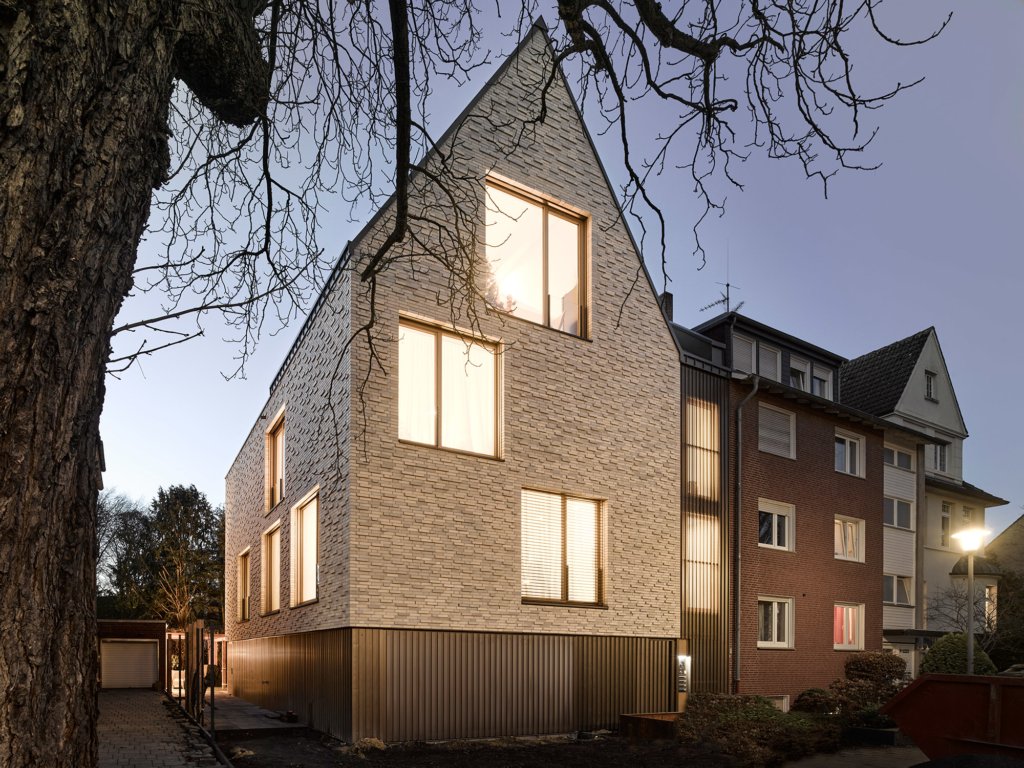 Entlang der repräsentativen Allee im Zentrum von Münster stehen viele freistehende (historische) Wohnhäuser und Verwaltungsbauten. Der Neubau des Hauses M orientiert sich in abstrahierter Form in Gebäudeform und Fassadengestaltung an der Nachbarbebauung. Die Materialität aus natursteinfarbigem Klinker und Fassadenblechen spiegelt die Farbigkeit der Umgebung wider.
