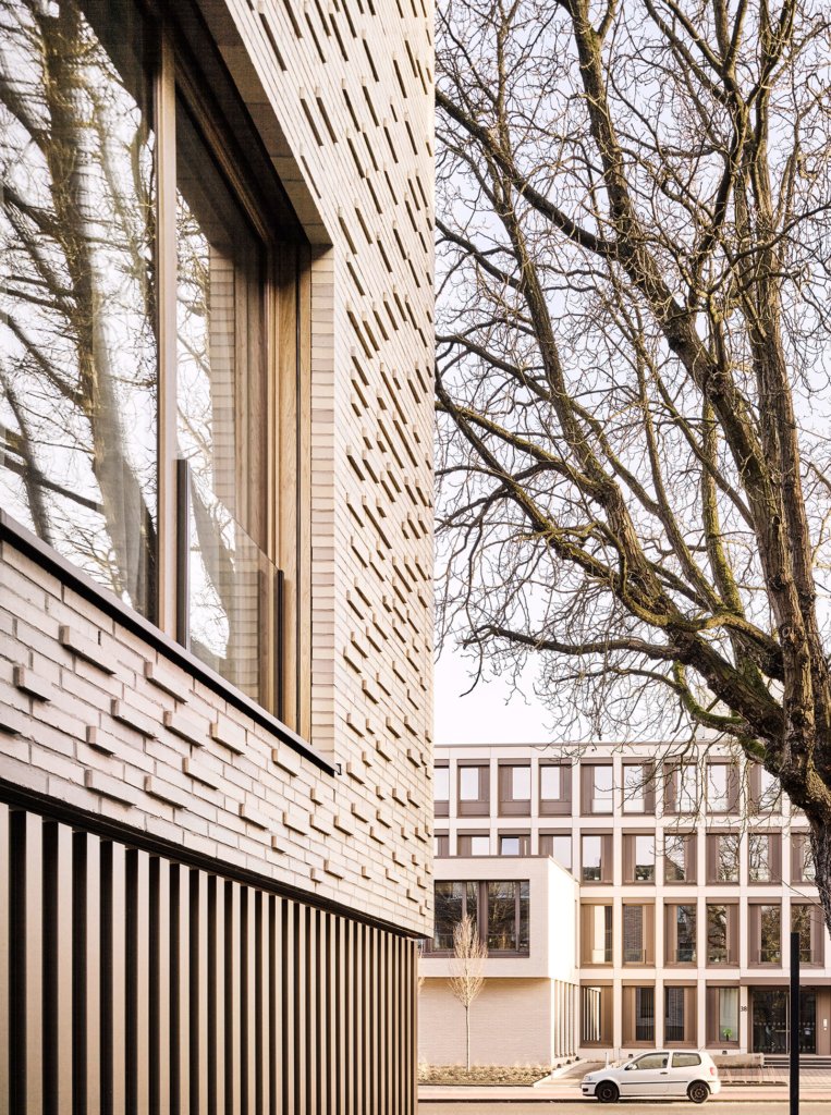 Der Klinker der Manufaktur Janninghoff ist in wildem Relief gemauert, die Fußsortierung, bei der nur die Rückseiten des Ziegels sichtbar sind, verleiht dem Mauerwerk eine gebrochene, weiche Struktur. Der Sockelbereich hingegen besteht aus bronzefarbenem lackiertem Aluminium mit regelmäßig vertikaler Kantung. Im Bereich des Treppenhauses zieht sich das gekantete Blech mit gelochter Stanzung bis in das Dach, ermöglicht so diffuse Einblicke auf die Treppen und lässt bei Dunkelheit das Innenlicht gestreut nach außen dringen.