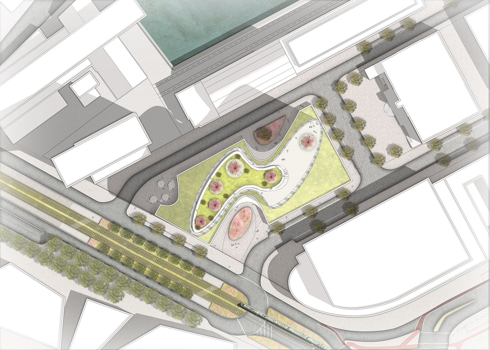Das Hotel nutzt neben den Flächen im Sockel auch das Dach der zwei Türme als Garten bzw. Skybar und Restaurant. Das Erdgeschoss öffnet sich zu allen Seiten und wird durch das Restaurant / Cafe im Südwesten sowie dem Nahversorger im Nordosten belebt. Auch Funktionen wie die Tiefgaragenzufahrt, die Anlieferung des Hotels und der Einzelhandel sind gänzlich integriert und Teil des architektonischen Konzeptes.