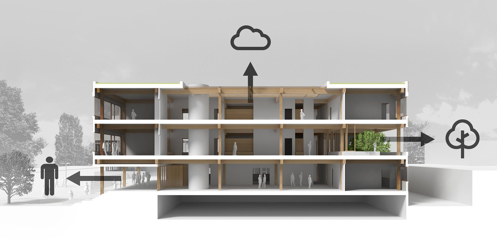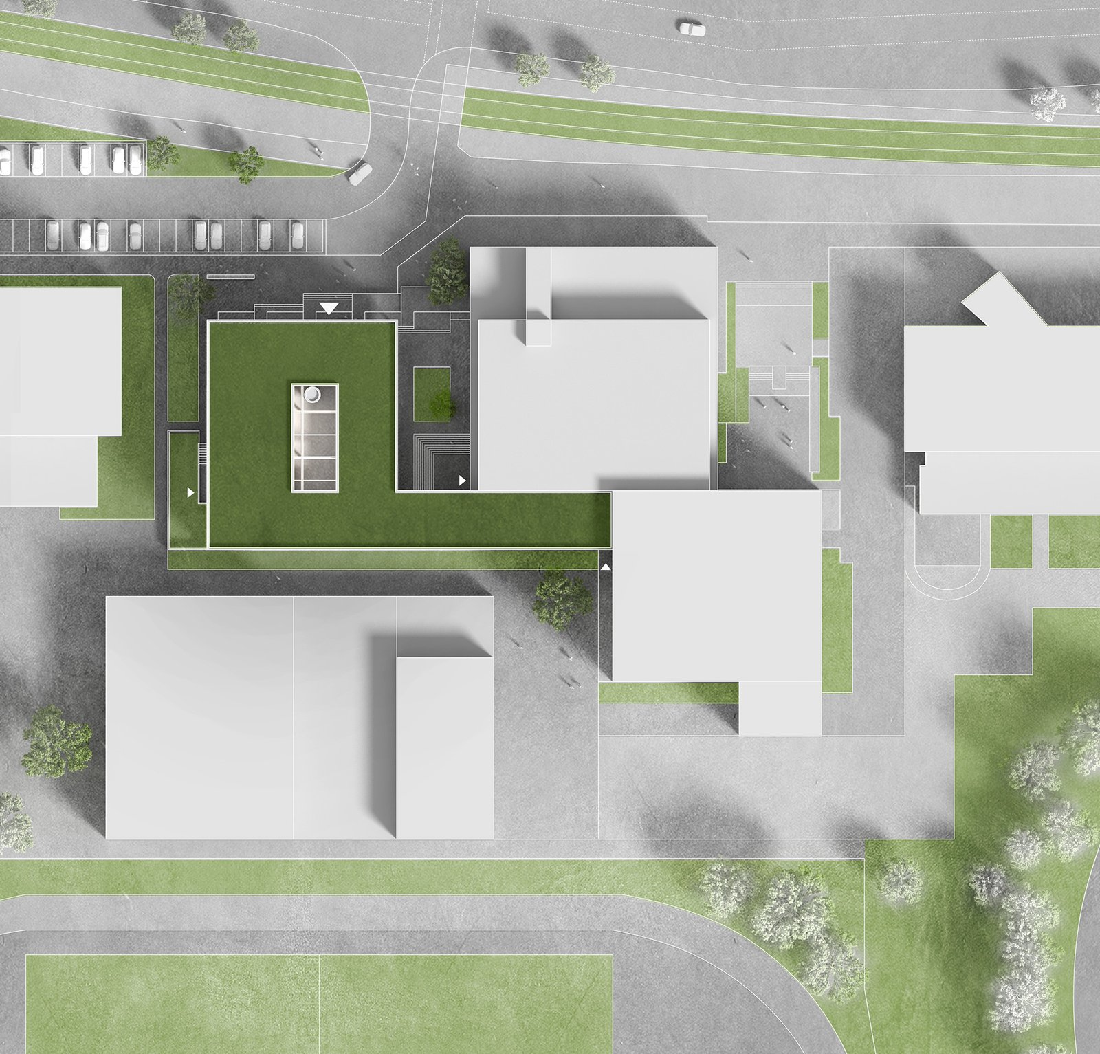 Das Johannes-Kepler-Gymnasium Garbsen soll im Zuge der G9-Erweiterung um Flächen von ca. 3.750 m² vergrößert werden, die Schule wird dabei von 4- auf 5,5 Züge erweitert. Das Raumprogramm umfasst allgemeine Unterrichtsflächen, Fachräume für Musik, Kunst, Werken und Naturwissenschaften sowie eine Hausmeisterwohnung. Der Entwurf platziert ein dreigeschossiges Bauvolumen maßgenau zwischen dem Bestandsgebäude und der benachbarten Realschule. Die kompakte Organisation erspart ein weiteres Treppenhaus, gewährleistet kurze Wege und eine optimale Anbindung und spart viel neue Fassadenfläche. Die Grundrisse sind um drei Marktplätze herum organisiert, die sich je nach Geschoss in unterschiedliche Richtungen öffnen und so jedem Bereich ein anderes Gesicht geben. Als Tragwerk wird eine Holzhybridkonstruktion vorgeschlagen, die Fassade erhält eine Verkleidung aus Holzlamellen.