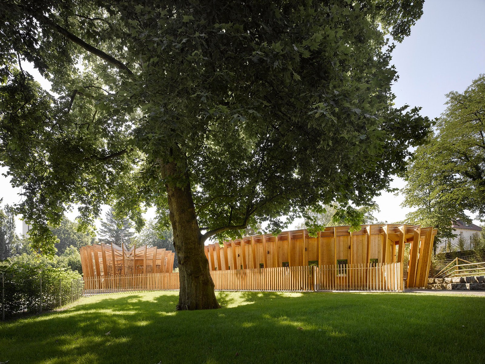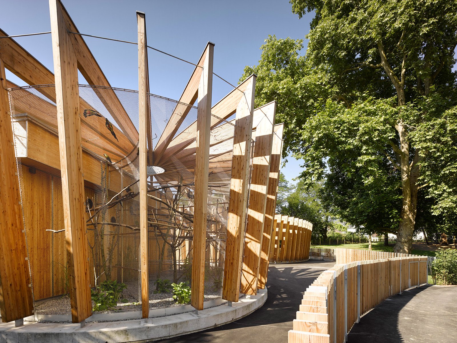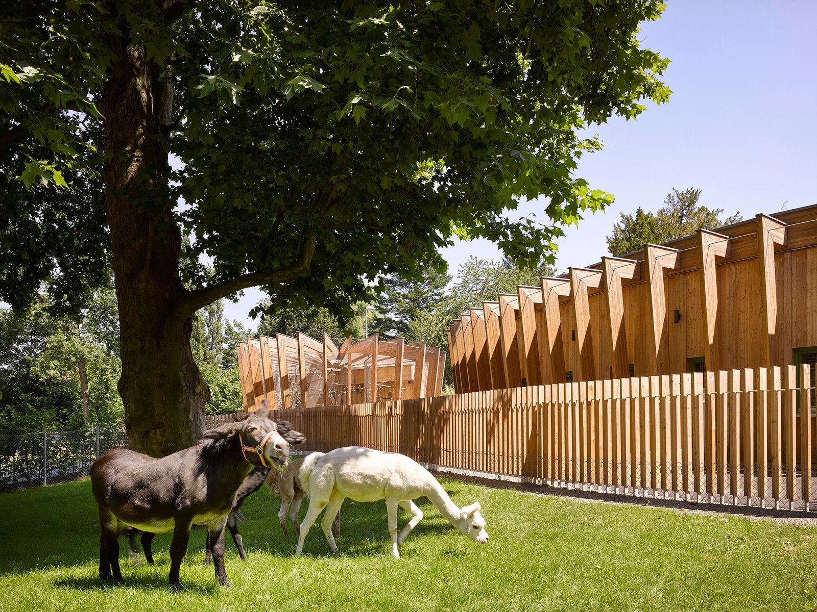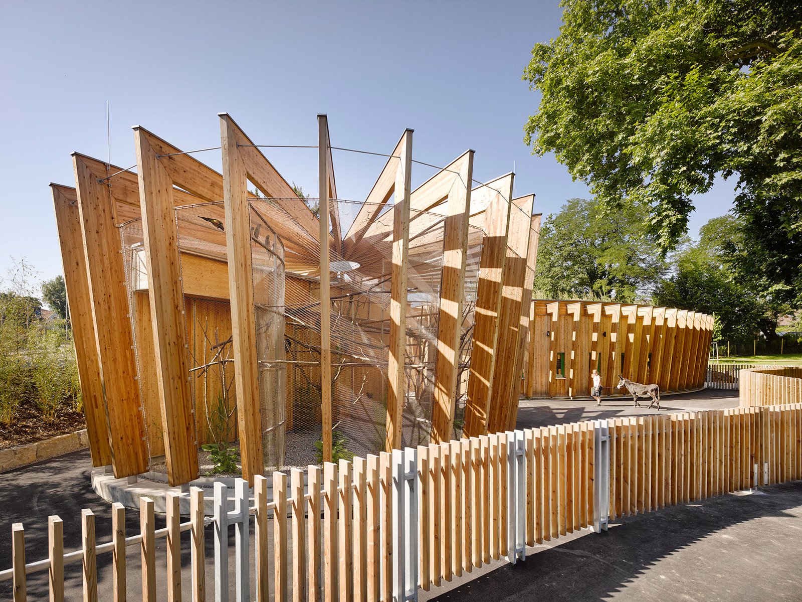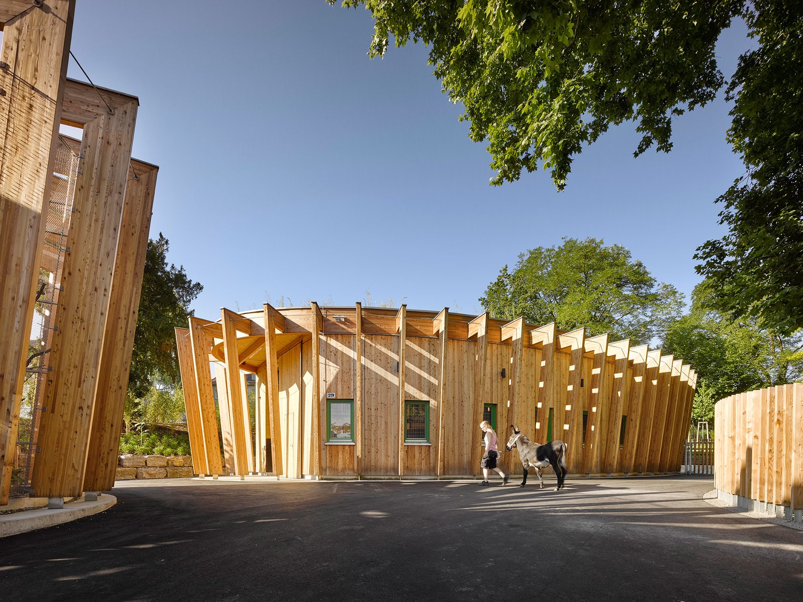Die lamellenartige Fassade von Voliere und Stall verstärken diesen lebhaften Effekt und verleihen den sehr funktionalen Volumen eine zweite Ebene. Der einladende Charakter ist auf die Augenhöhe von Kindern abgestimmt und soll zum Verweilen einladen.