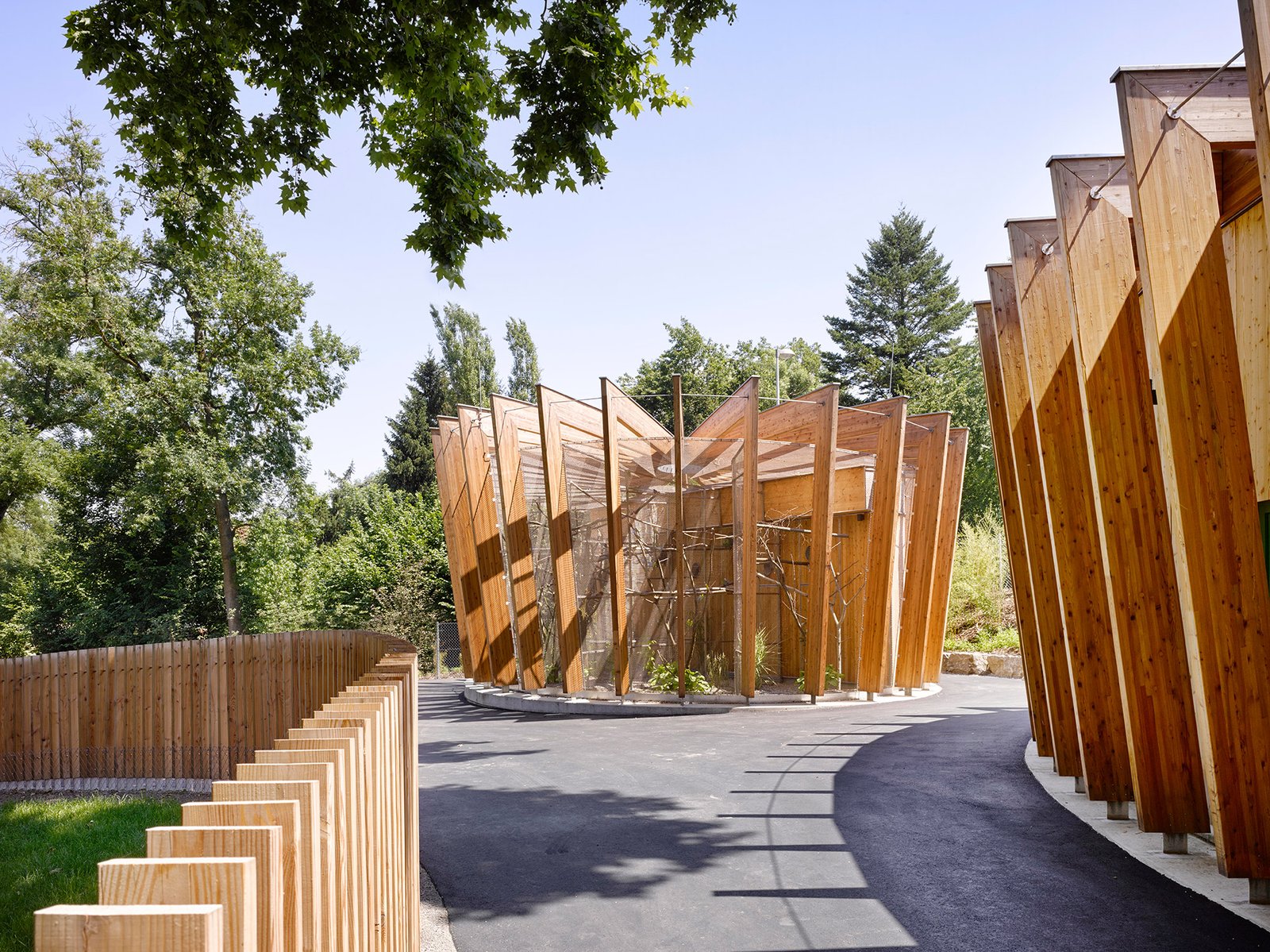 Der Streichelzoo wurde anlässlich der Landesgartenschau in Öhringen errichtet. Die drei Elemente – Tierstall, Voliere und Zaun – sind durch ihre formale Umsetzung und das tonangebende Material Lärche stark zusammengebunden.