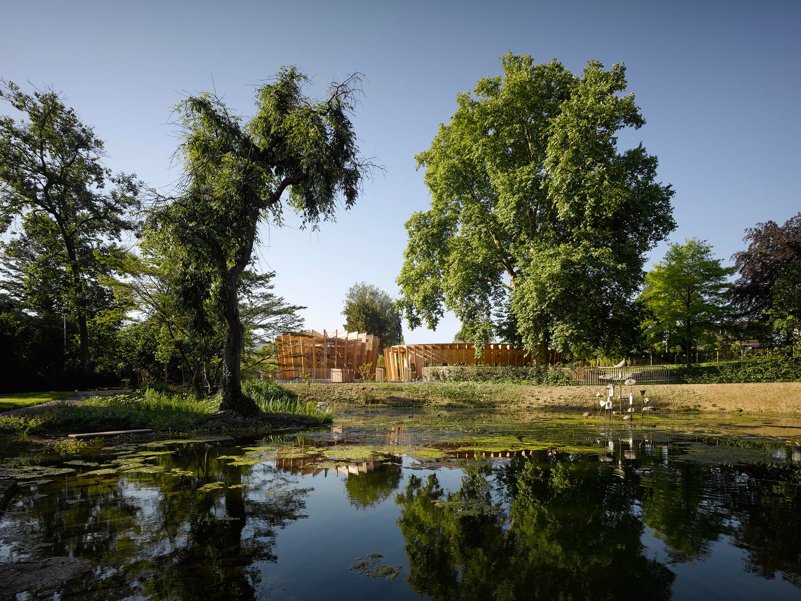Das Ensemble reagiert mit seiner formalen Gestalt stark auf den städtebaulichen Kontext sowie die spezielle Nutzung. Die exponierte Lage im südlichen Teil des Schlossgartens in direkter Nähe zum Teich lässt die zwei Gebäudevolumen und den dazugehörigen Zaun spielerisch vermitteln und schafft wechselnde Blickbeziehungen von allen Richtungen. Auf diese Weise wirken die drei Elemente sehr stark als ein Ganzes, welches aber aufgegliedert und leicht erscheint.