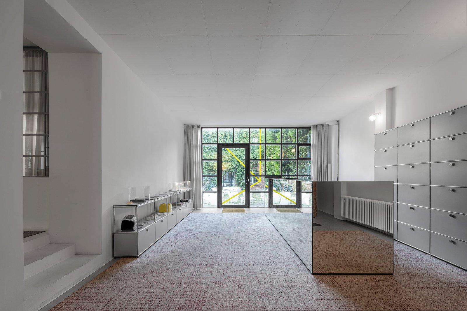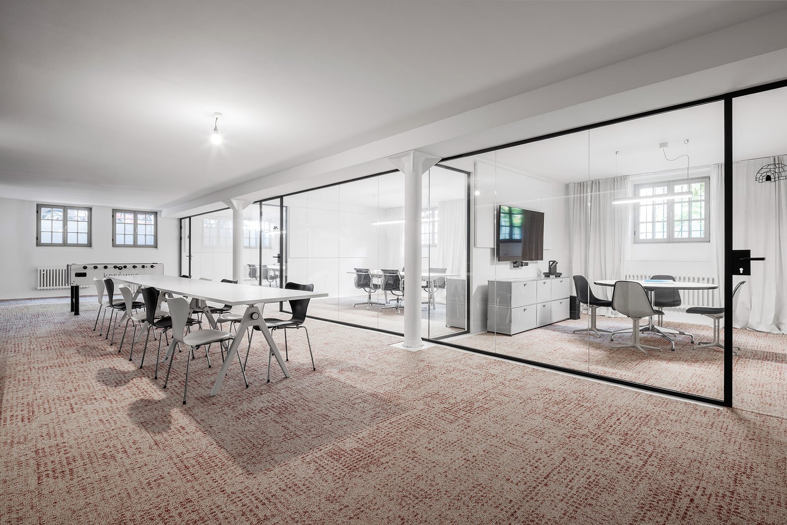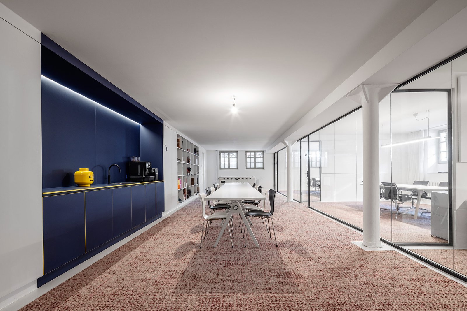 Die neuen Büroräume von KRESINGS befinden sich im Hauptfabrikgebäude auf dem Gelände der ehemaligen Kornbranntweinbrennerei im Hansaviertel von Münster. Die ehemalige industrielle Nutzung des Komplexes ist noch heute deutlich an der hanseatischen Backsteinarchitektur mit dem weithin sichtbaren Schornstein zu erkennen. Die Innenarchitektur inszeniert den Kontrast zwischen Alt und Neu. Dicke Wände, sichtbares Backsteinmauerwerk und schwere Holzbalken treffen auf viel Weiß, klare Kanten, glatte Flächen und geometrische Formen. Kreisrunde Wandöffnungen im Innenraum, kubische Möbel, Wandelemente und Einbauten in Primärfarben - radikal reduziert und einfach.